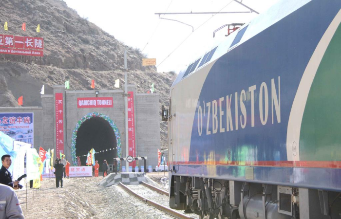2016年2月27日,一列专列停在乌兹别克斯坦安格连至琶布铁路甘姆奇克隧道进口。这一隧道长19.26公里,为中亚第一长隧、乌兹别克斯坦一号工程,也是“丝绸之路”经济带铁路网中吉乌铁路的重要一环。