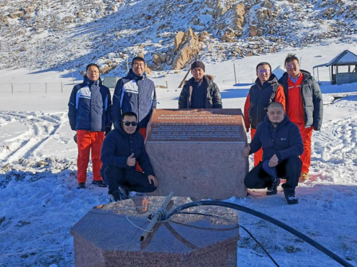 执行中吉乌铁路可行性研究的中铁第一勘察设计院专家团队成员在吉尔吉斯斯坦纳伦州的“中吉友谊井”(前)和纪念石碑旁合影。
