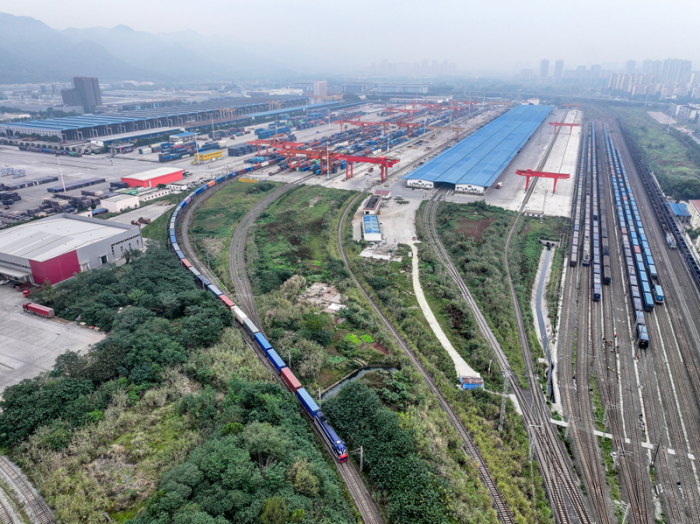 第10万列中欧班列—X8083次中欧班列(重庆—杜伊斯堡)在重庆团结村站顺利发车。