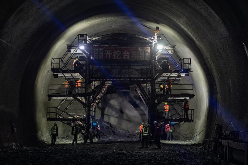工人在西渝高铁康渝段北屏隧道掌子面进行施工作业。