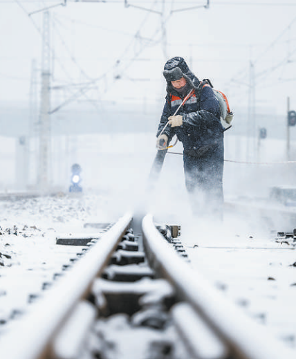 春运期间,中国铁路沈阳局集团公司阜新工务段职工进行道岔除雪作业,保障运输安全。