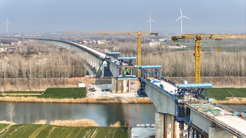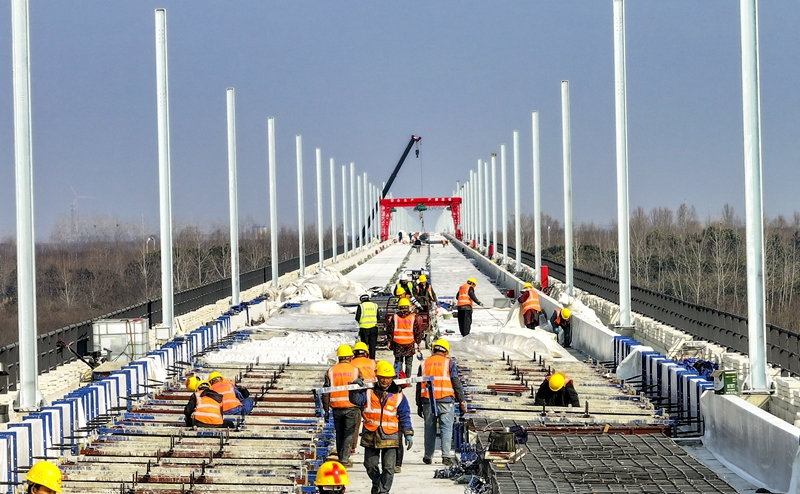 阜淮铁路项目建设者在蒙城特大桥施工。