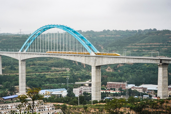 联调联试综合检测列车驶过位于陕西省西安市的西延高铁渭河特大桥。