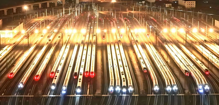 2月2日,列车在天津动车客车段天津动车运用所停车场整装待发。