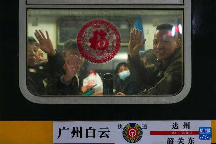 2月1日深夜,在广州白云站,乘坐K4232次列车的旅客们挥手告别。2月2日凌晨0时01分,开往四川达州的K4232次列车缓缓驶离广州白云站,这是2026年粤港澳大湾区开出的首趟春运列车。