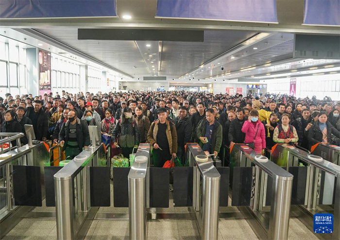 2月2日,旅客在西安站候车大厅内候车。