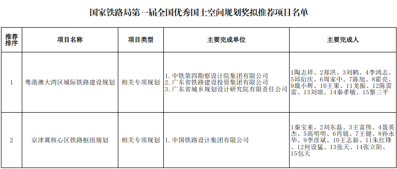国家铁路局第一届全国优秀国土空间规划奖拟推荐项目名单公示