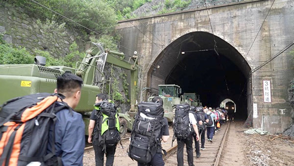 随后,突击队成员徒步携带生活物资向安家庄站、落坡岭站行进。身负30至40斤背包,沿着受损的铁路线,徒步11余公里,穿越7个隧道,为安家庄站、落坡岭站滞留旅客及时送去物资。