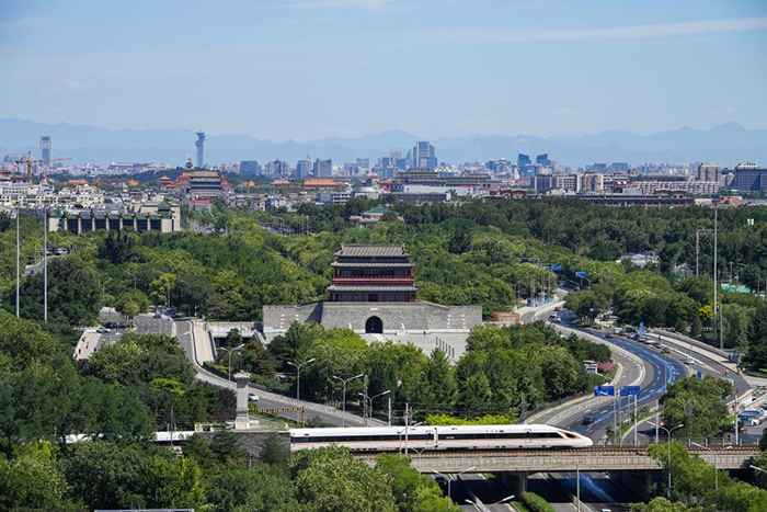 2024年7月18日,一列复兴号高铁列车从北京永定门城楼前驶过。