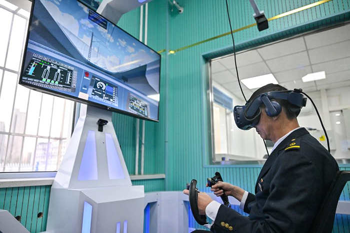 2024年12月19日,在国铁北京局北京动车段北京北动车运用所,动车组司机安秀旗使用VR模拟驾驶设备训练。