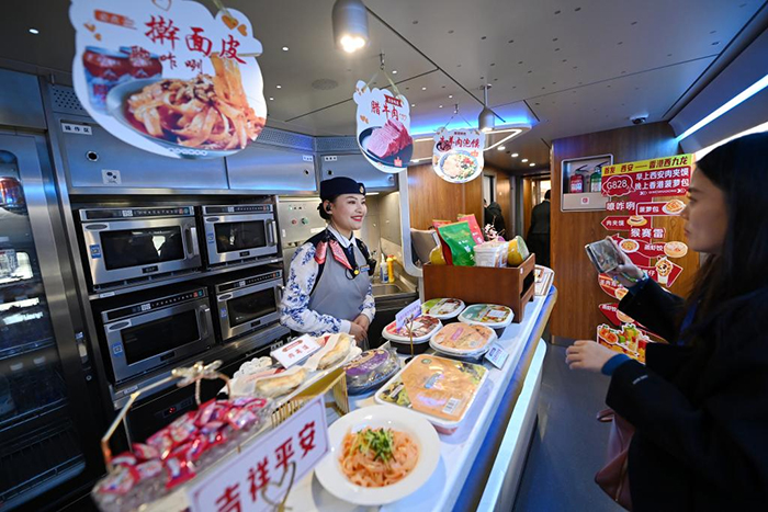 2025年1月5日,在G828次西安至香港直达高铁列车上,乘务人员为旅客介绍餐车服务情况。