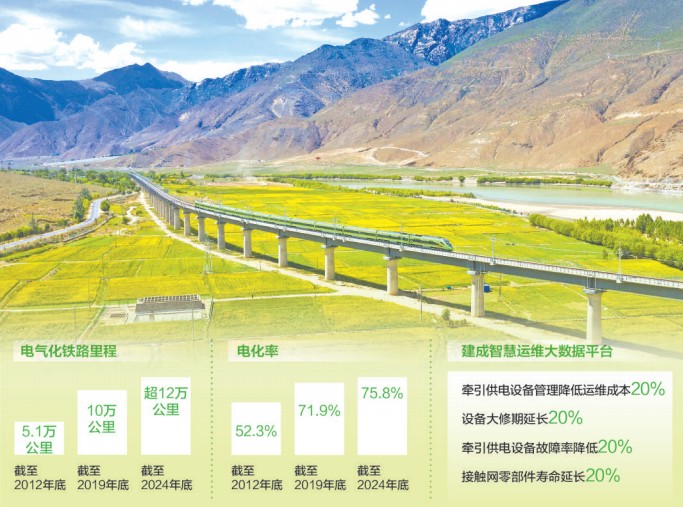 从无到有、从普速到高速、从传统到数智,“电气化”成为观察中国铁路发展的一个视角。数据显示,截至2024年底,全国铁路营业里程16.2万公里,其中电气化铁路里程超12万公里,电化率达75.8%。
