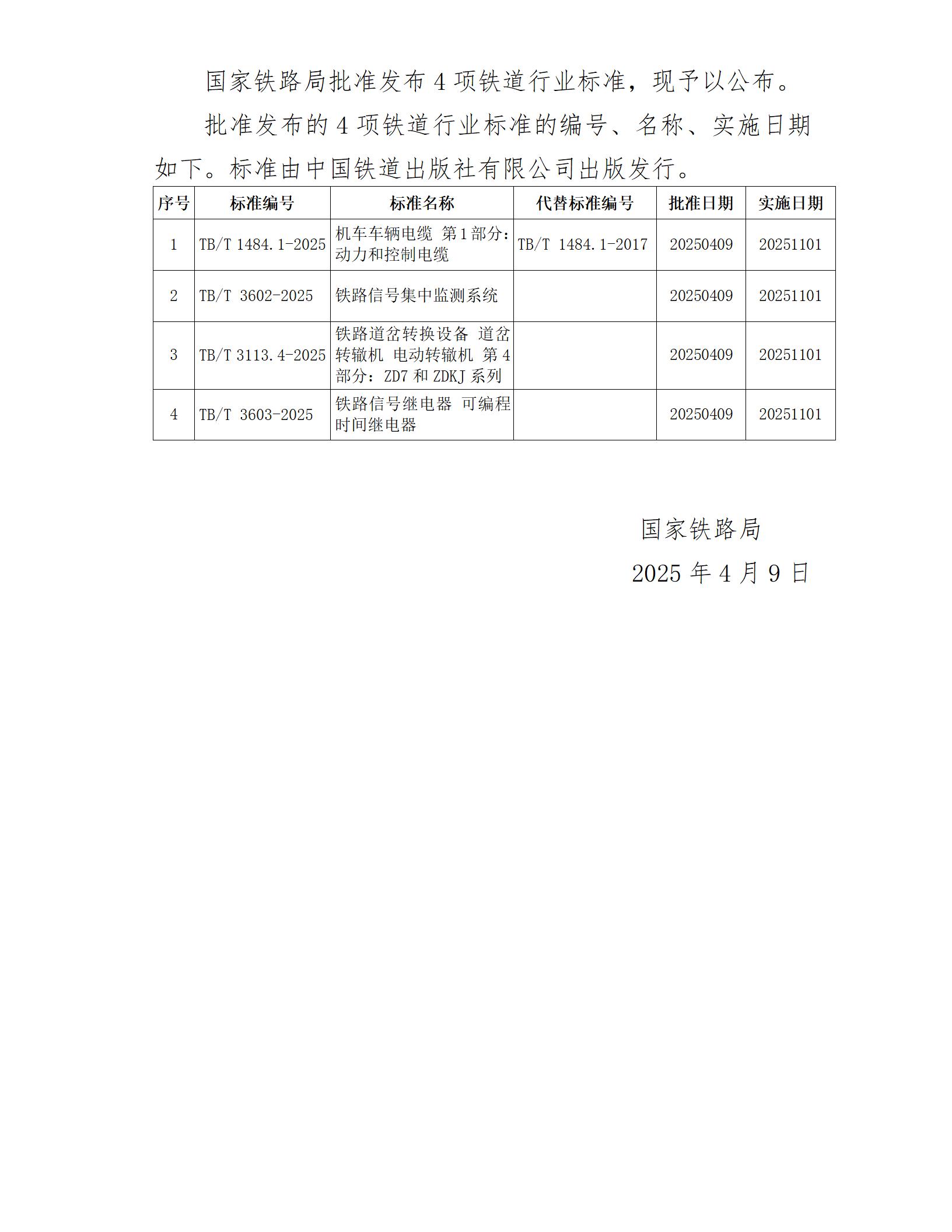 国家铁路局关于发布铁道行业标准的公告(技术标准2025年第1批)