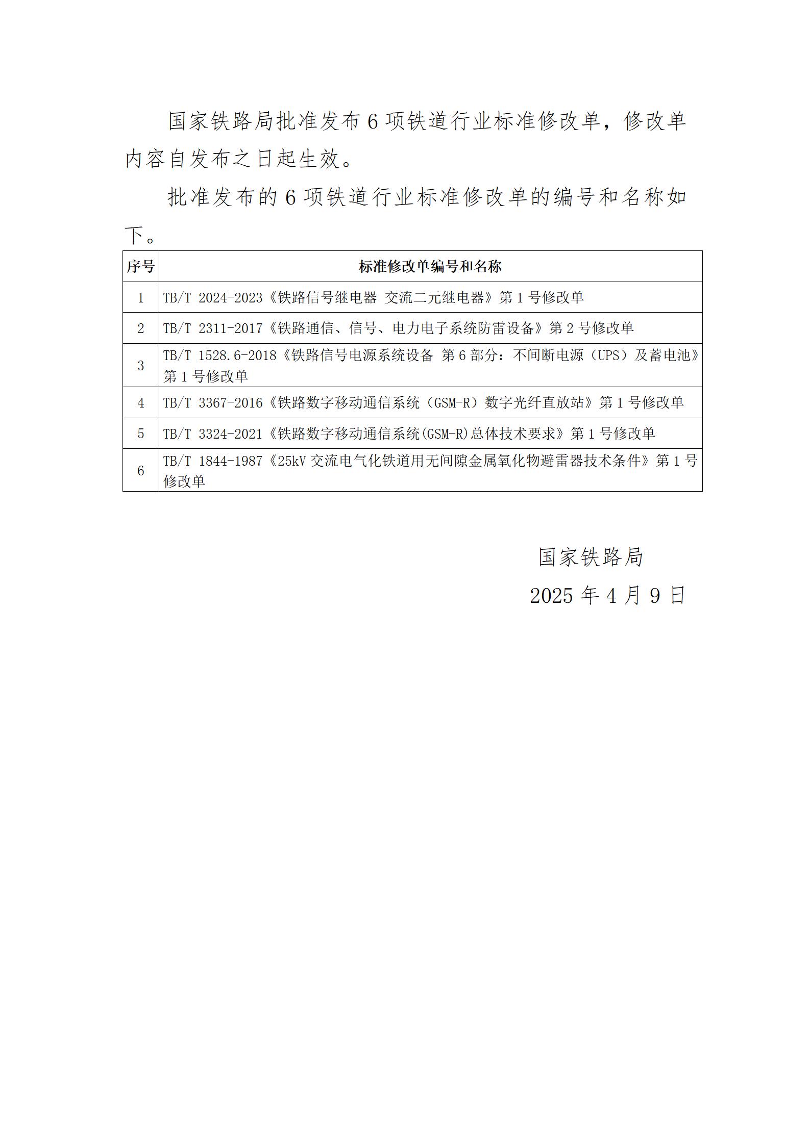 国家铁路局关于发布铁道行业标准的公告(技术标准2025年第2批)