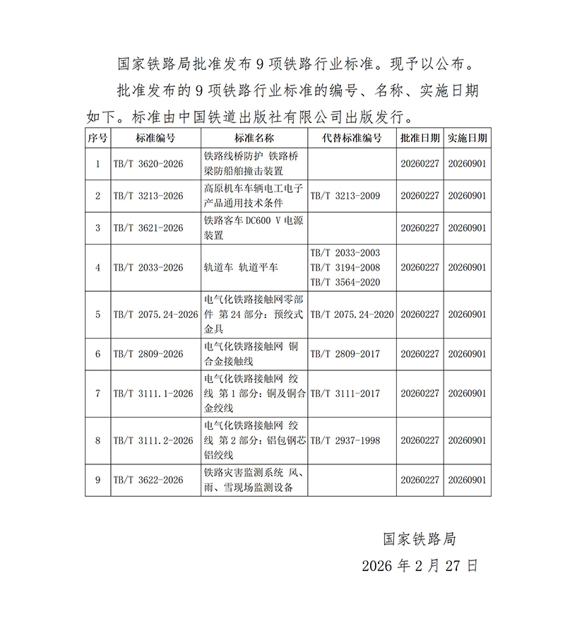 国家铁路局批准发布《铁路线桥防护 铁路桥梁防船舶撞击装置》等9项铁路行业标准。