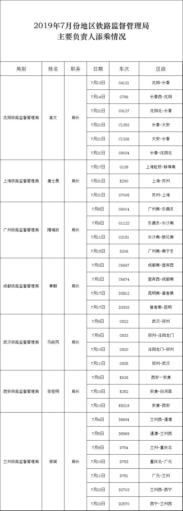 2019年7月份地区铁路监督管理局主要负责人添乘情况