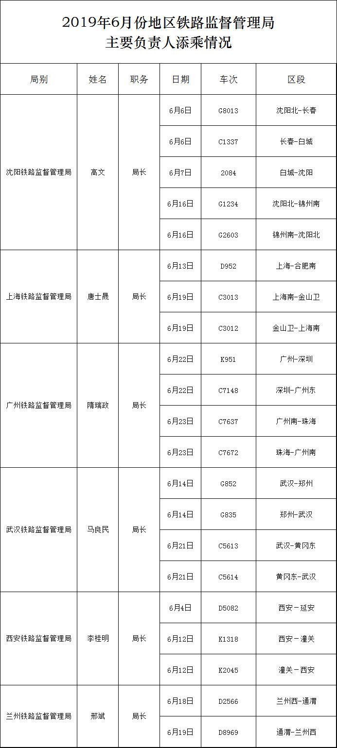 2019年6月份地区铁路监督管理局主要负责人添乘情况