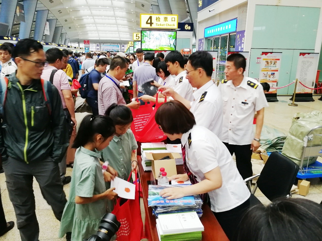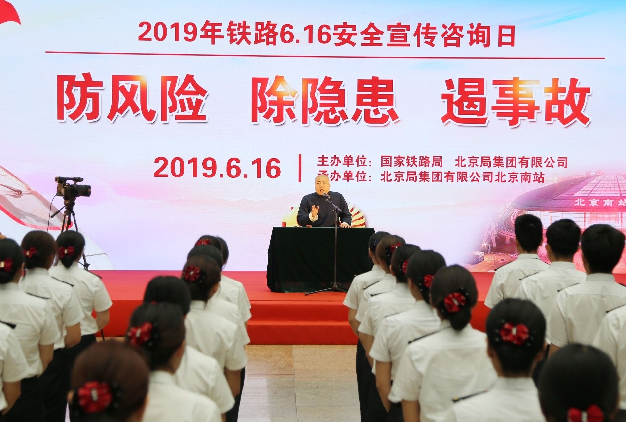 6月16日,国家铁路局、中国铁路总公司、住房和城乡建设部、交通运输部联合组织全国铁路2019年“6.16”安全宣传咨询日暨京广高铁沿线环境综合整治动员会,主会场设在中国铁路总公司。国家铁路局副局长于春孝、铁路总公司副总经理刘振芳、应急管理部安全生产综合协调司负责人出席动员会并讲话。本次动员会以“防风险、除隐患、遏事故”为主题,集中开展了面对铁路职工及铁路沿线社区、农村、学校等地方和单位的爱路护路普法宣传。