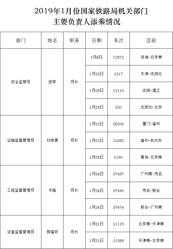 2019年1月份国家铁路局机关部门主要负责人添乘情况