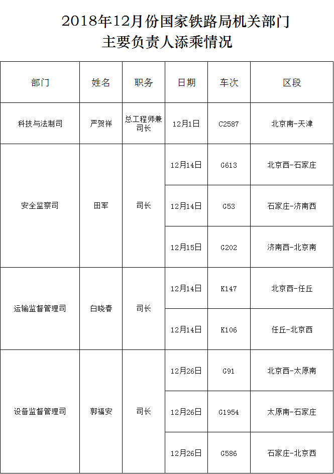 2018年12月份国家铁路局机关部门主要负责人添乘情况