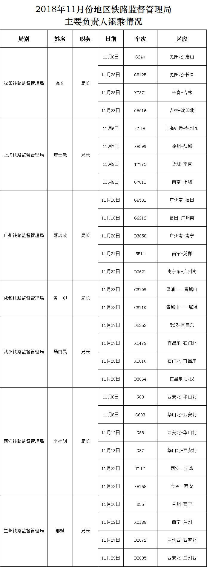 2018年11月份地区铁路监督管理局主要负责人添乘情况