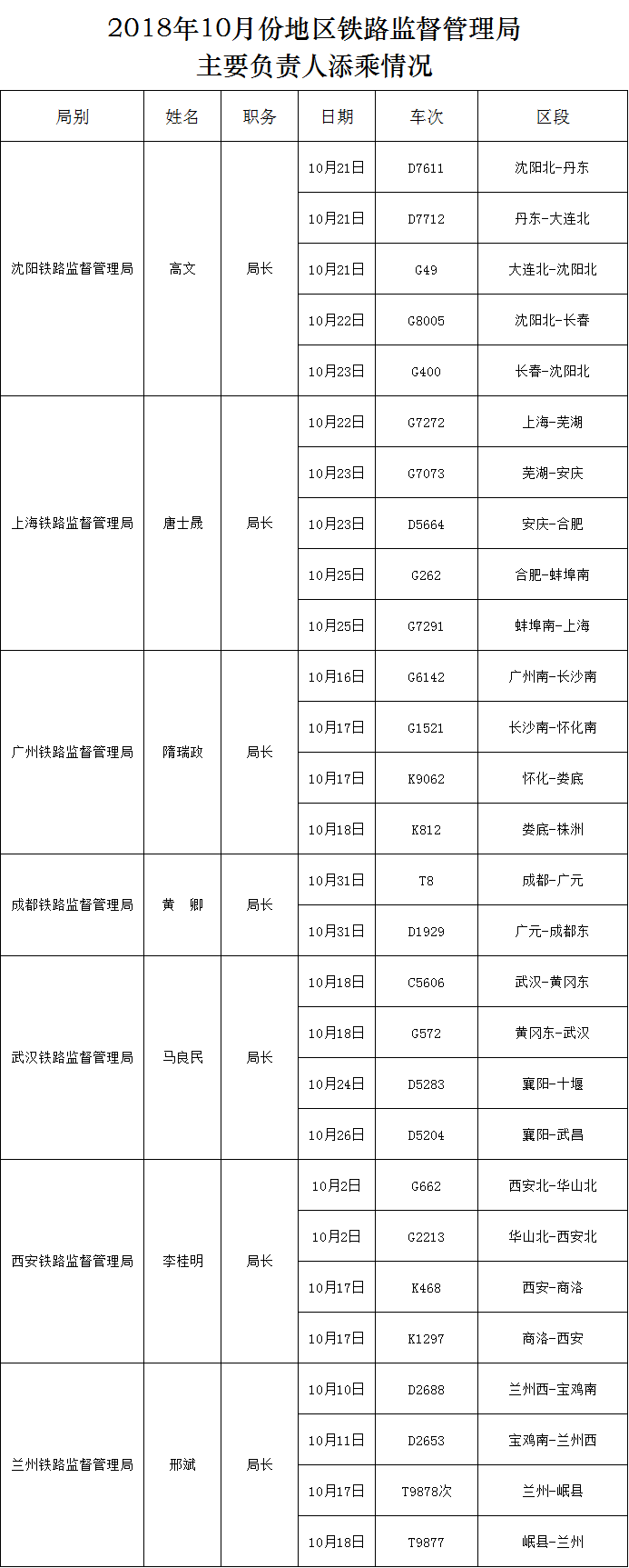 2018年10月份地区铁路监督管理局主要负责人添乘情况