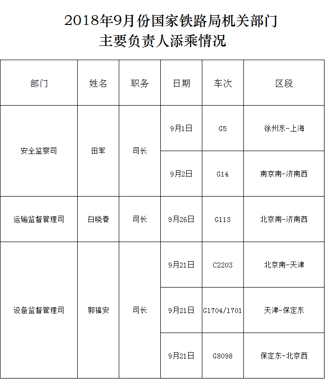 2018年9月份国家铁路局机关部门主要负责人添乘情况