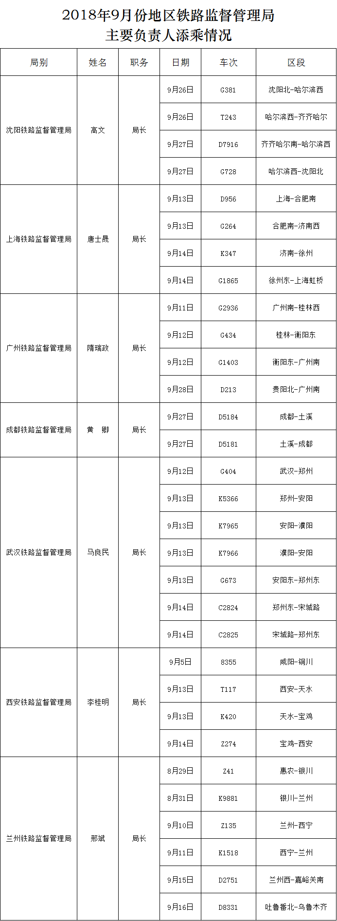 2018年9月份地区铁路监督管理局主要负责人添乘情况