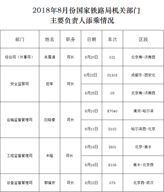 2018年8月份国家铁路局机关部门主要负责人添乘情况