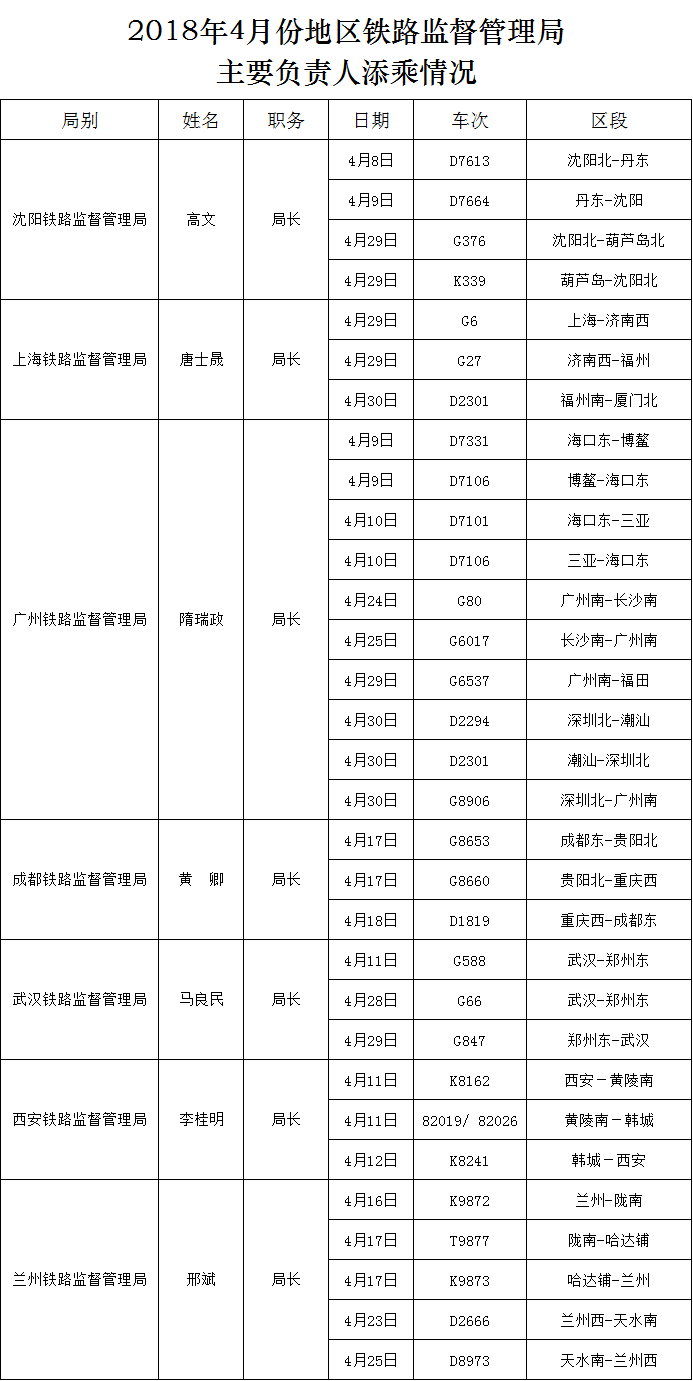 2018年4月份地区铁路监督管理局主要负责人添乘情况
