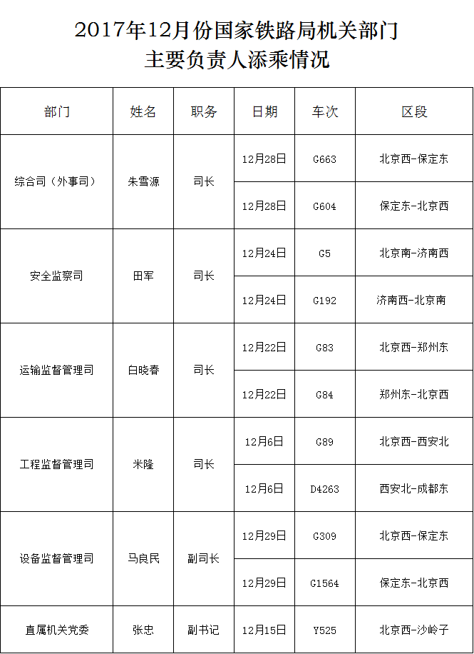 2017年12月份国家铁路局机关部门主要负责人添乘情况