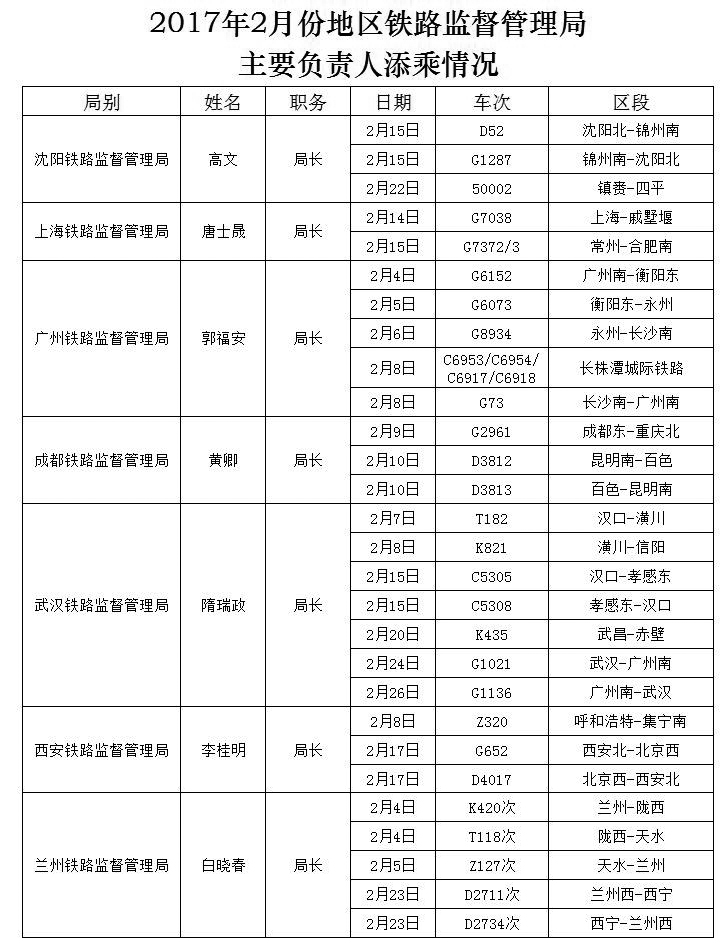 2017年2月份地区铁路监督管理局主要负责人添乘情况