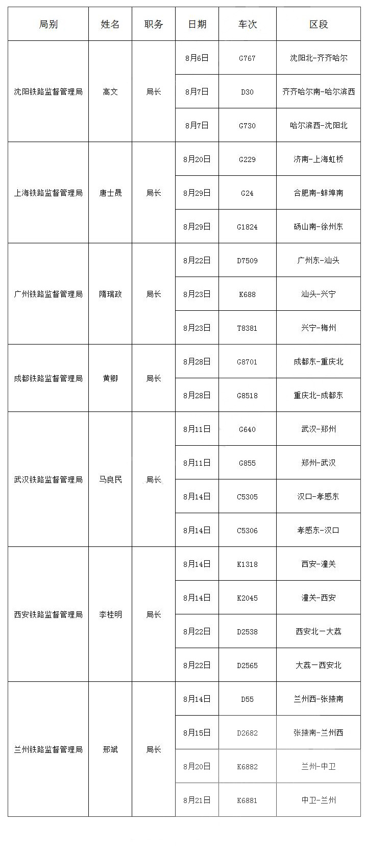 2019年8月份地区铁路监督管理局主要负责人添乘情况