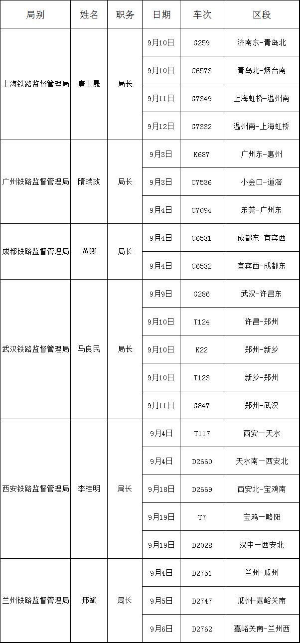 2019年9月份地区铁路监督管理局主要负责人添乘情况