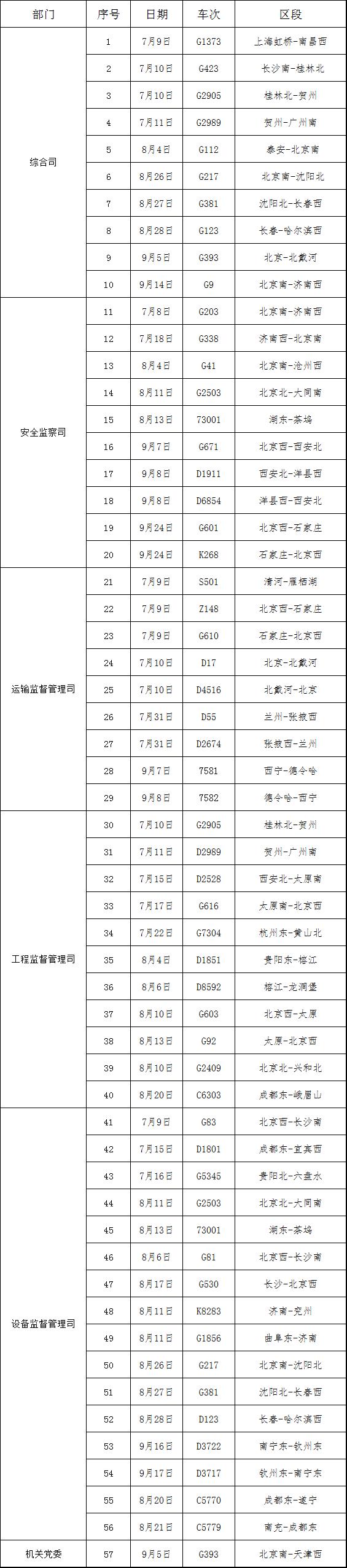 2020年三季度国家铁路局机关部门负责人添乘情况