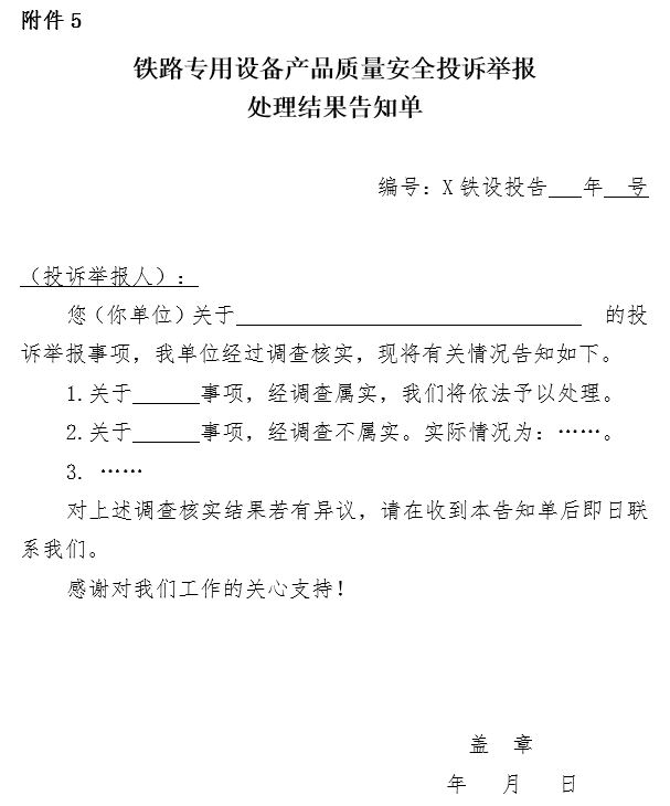 5.铁路专用设备产品质量安全投诉举报处理结果告知单