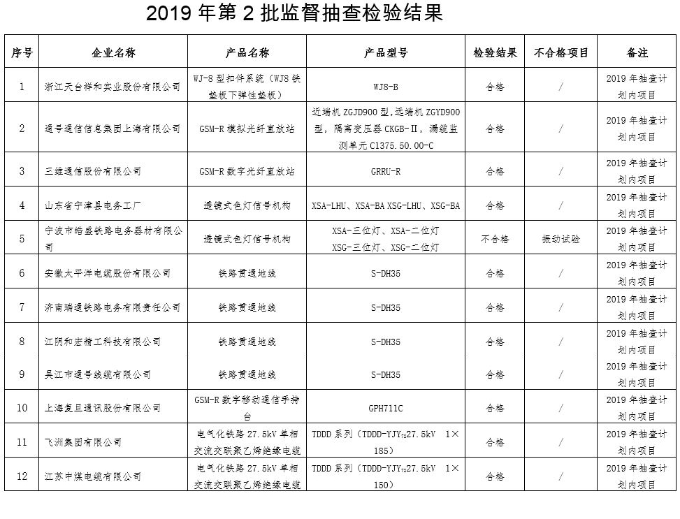 根据《铁路专用产品质量监督抽查管理办法》(国铁设备监〔2017〕79号),现将2019年第2批铁路专用产品质量监督抽查情况通报如下:
