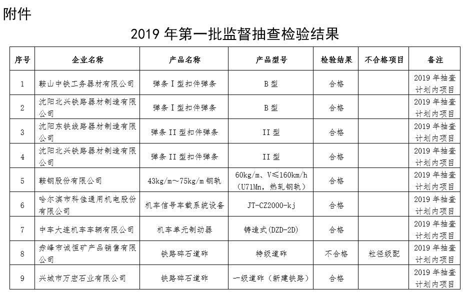 根据《铁路专用产品质量监督抽查管理办法》(国铁设备监〔2017〕79号),现将2019年第1批铁路专用产品质量监督抽查情况通报如下: