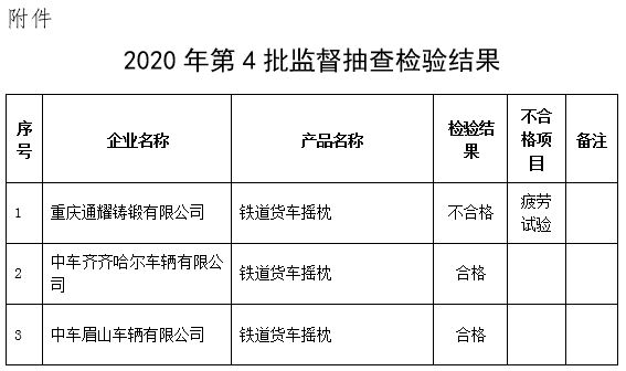 铁道货车摇枕共抽查3厂项,1厂项不合格,不合格原因为疲劳试验不合格。