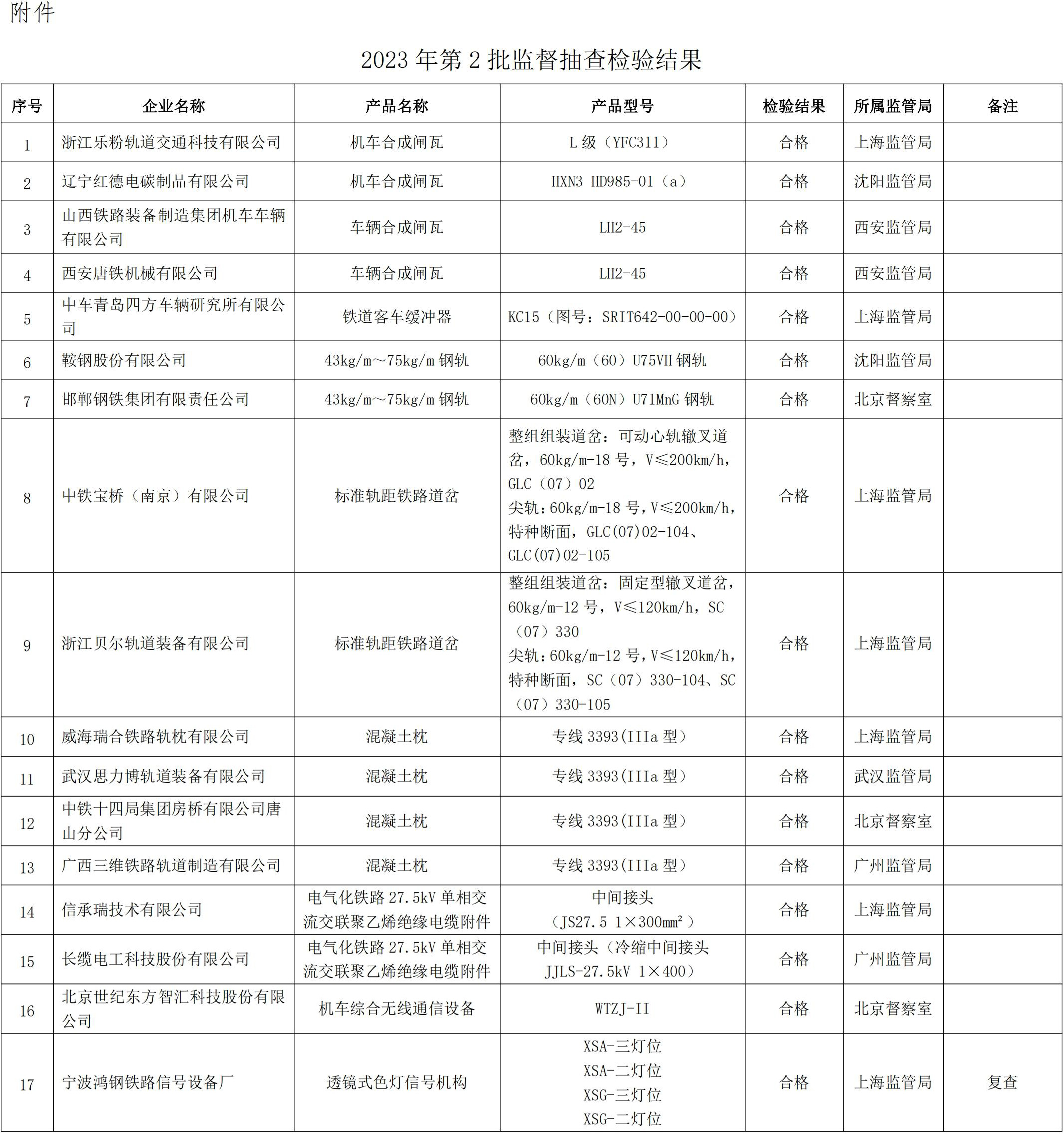 根据《铁路专用产品质量监督抽查管理办法》(国铁设备监规〔2023〕18号)相关规定,现将2023年第2批铁路专用产品质量监督抽查情况通报如下: