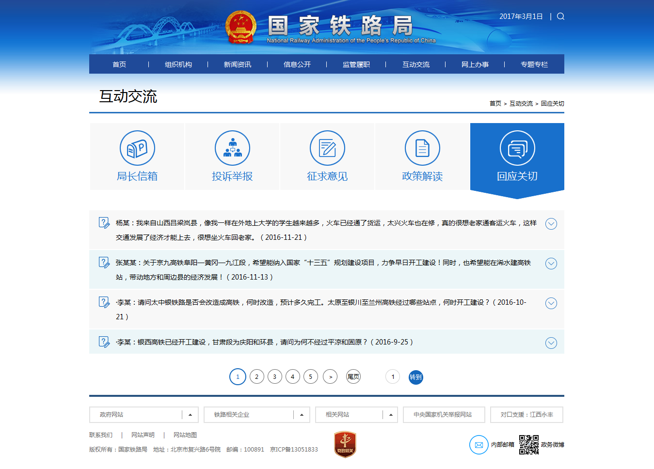 (六)积极回应社会关切。一是加强政务舆情回应制度机制建设,制定了网络舆情监测处置管理办法、政务微博管理实施意见等舆情回应制度,初步建立舆情监测回应工作机制。二是加强与网民的互动回应,在主页面开设《回应关切》栏目,对《局长信箱》、《投诉举报》中具有普遍性、代表性的意见建议及相应的处理结果在网上公开回复。全年共办理回复网民邮件2302件,公开回复意见29件。三是对发生铁路交通事故等突发事件,铁路监管部门第一时间到现场了解情况,及时对外公布相关信息。