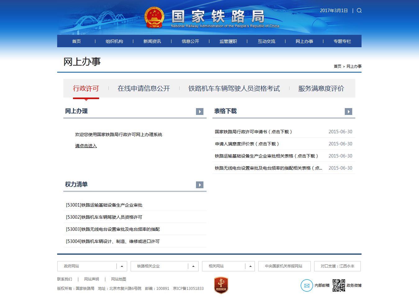 (一)行政许可信息公开。及时梳理公布行政许可权力清单、规章制度、办理程序、服务指南、许可决定、许可企业和产品名录等信息,并为申请人提供表格下载、过程查询等服务。进一步精简优化行政审批程序,发布新修订的行政许可实施程序规定和工作流程。组织对许可申报材料进行逐项梳理,取消了铁路运输基础设备生产企业审批中不必要的证明材料并及时发布信息。清理行政审批涉及的中介服务,公开发布已取消事项信息。设立行政许可咨询电话,为申请企业提供信息咨询服务。认真组织做好铁路机车车辆驾驶人员资格考试,及时发布考试公告和考试成绩公示。组织对政府部门规章及规范性文件进行全面清理,公布废止9件与简政放权改革精神不符的原铁道部文件。