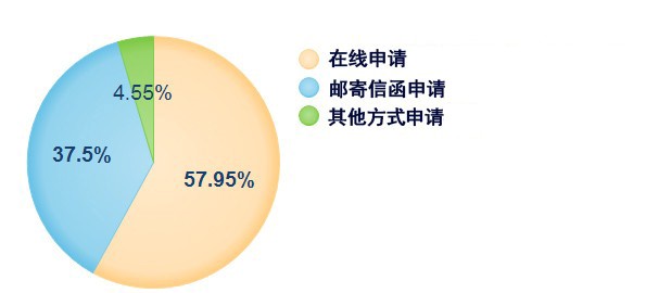 从申请公开方式看,在线申请系统申请51件,占57.95%;邮寄信函申请33件,占37.50%;其他方式提交申请4件,占4.55%。