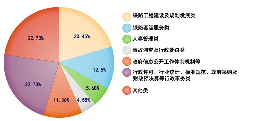 从申请公开信息类型看,涉及铁路工程建设及规划发展事项的18件,占20.45%;涉及铁路客运服务类信息的11件,占12.50%;涉及人事管理的5件,占5.68%;涉及事故调查及行政处罚的4件,占4.55%;涉及政府信息公开工作体制机制等内容的10件,占11.36%;涉及行政许可、行业统计、标准规范、政府采购及财政预决算等行政事务的20件,占22.73%;其他类信息20件,占22.73%。