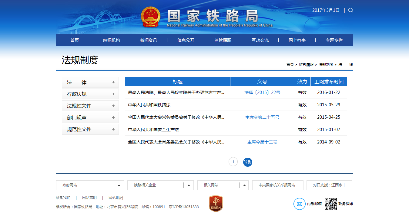 (三)法规及标准规范信息公开。一是及时公开铁路行业履职监管相关法律法规及部门规章7件,制定发布规范行政许可、行政执法工作,加强合法性审查、建立健全法律顾问制度等规范性文件19件。二是加强重要技术标准的制修订发布工作,编制发布8批铁道行业技术标准公告,116项铁道行业标准。编制发布《铁路隧道设计规范》等11项工程建设标准。