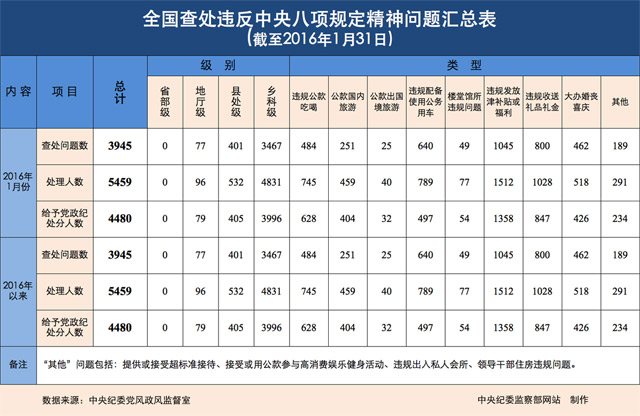 2016年1月全国查处违反中央八项规定精神问题3945起