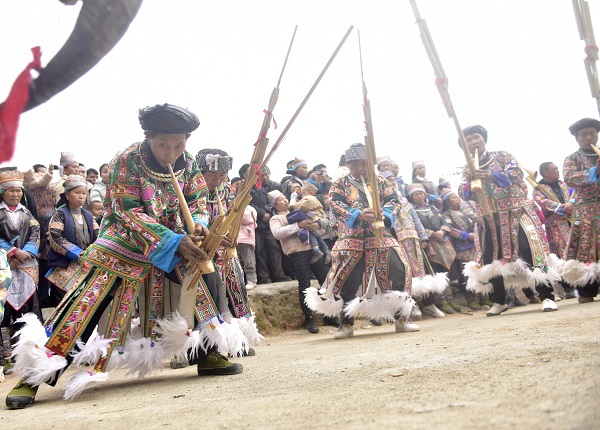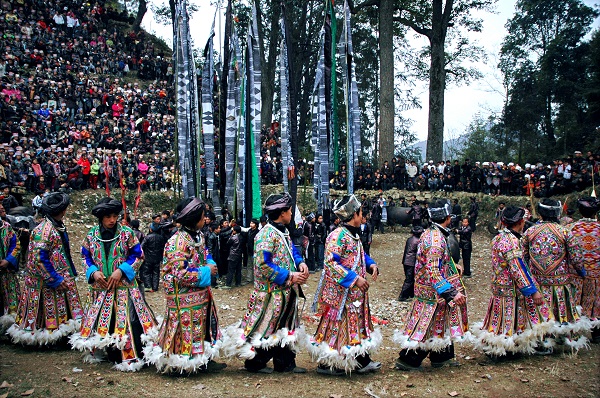 6.活动内容:杀牛祭祖、祭神、吹芦笙、踩歌堂、跳月、跳古瓢舞、情歌对唱、回堂酒、吃簸箕饭。