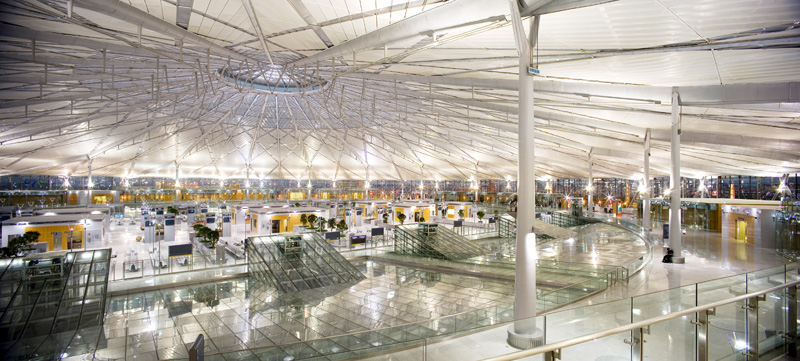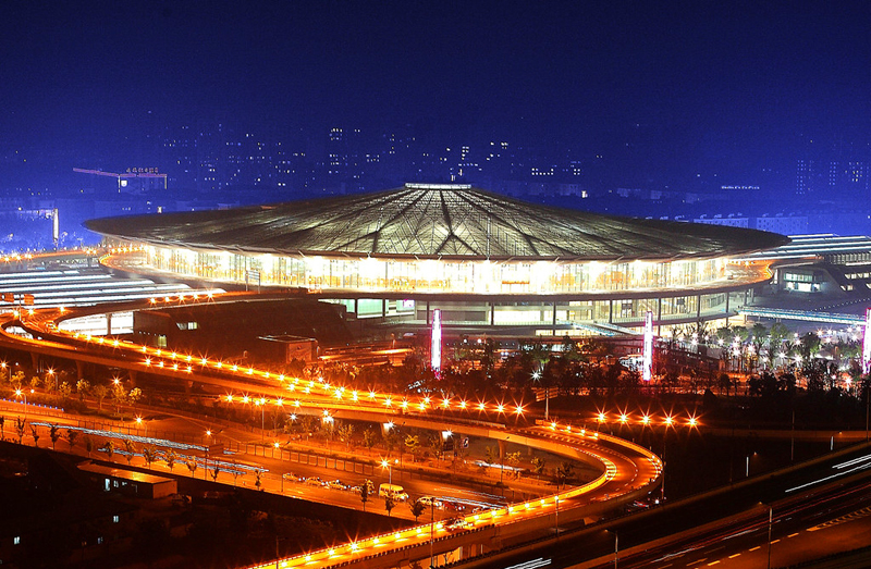 1.圆形钢屋盖吊装采用自主创新研制的“大跨度张弦式回转龙门吊”施工,由于施工环境复杂、施工场地狭小,常规大型吊装设备无法进入结构内部施工,故在施工中采用大跨度张弦式回转龙门吊对称吊装圆形钢屋盖,较好的解决了超大型圆形钢屋盖的吊装问题;2.9.9m平台超长环型预应力梁采用分块施工方法,解决了大量回填土下高空大面积排架搭设,工字形大截面梁钢筋、模板、砼施工、多方向预应力张拉顺序确定,在次应力情况下张拉力控制以及跨越铁路营业线施工的安全防护问题;3.既有沪杭线翻交基坑围护施工技术应用,运行中的沪杭铁路距站房仅5.2m,为保证铁路运行安全以及基坑围护结构安全,站房地下工程施工分为南北两块先后施工,通过沪杭铁路翻交保证了铁路运行和工程施工安全;4.9.9m平台环型框架结构柱采用直径1m的钢管劲性柱,钢管柱内为C60砼,钢管柱外为C40砼;5.站场线路采用宽轨枕线路;6.铁路无站台柱雨棚应用铸钢节点,保证了雨棚受力合理,安全可靠;7.钢屋盖采用铝板和阳光板组合形式,白天候车室照明采用自然采光,节能环保。