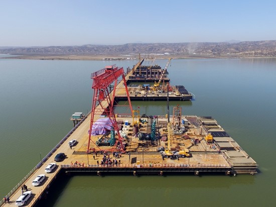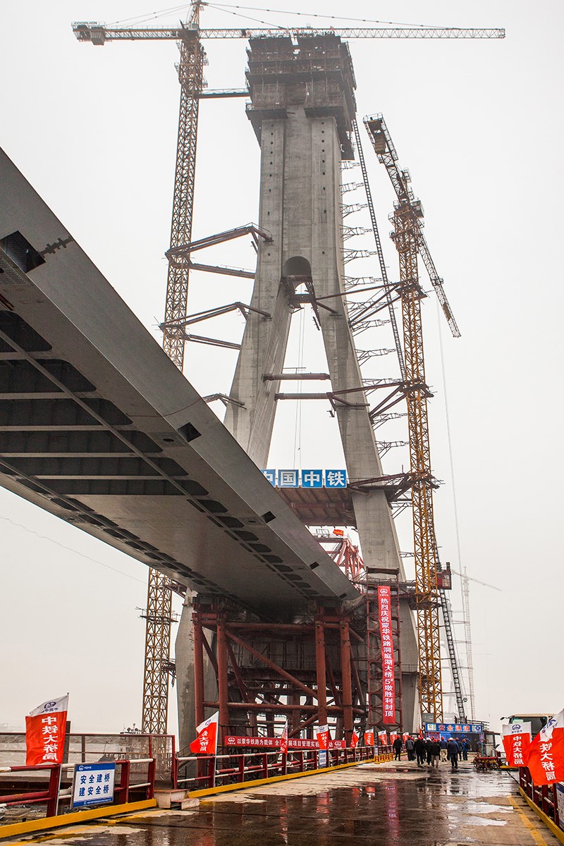 图11 三门峡黄河公铁两用大桥主桥施工现场 图12 洞庭湖特大桥首座主塔墩封顶