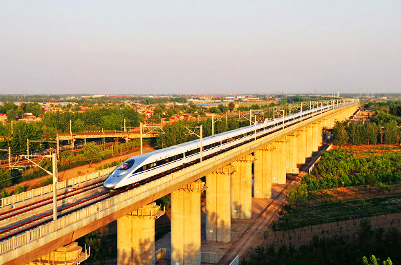 2011年6月30日,世界上一次建成里程最长的京沪高速铁路开通运营。京沪高速铁路全长1318公里,连接京沪两地,贯通我国东部最发达地区,设计时速350公里,初期运营时速300公里。2010年12月3日,新一代“和谐号”动车组CRH380AL在京沪高速铁路枣庄至蚌埠间的试验段创造了时速486.1公里运营列车试验速度新纪录。